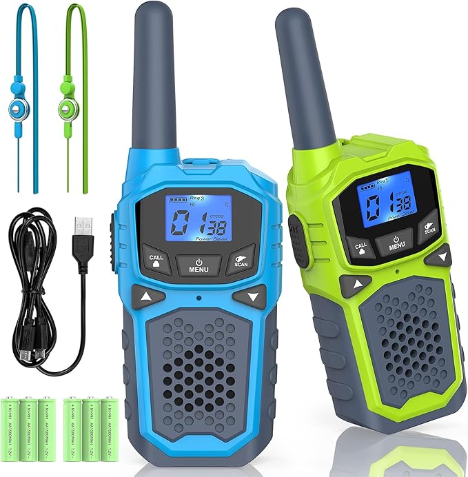 - 【Rechargeable Walkie-Talkies】Powered by 3 AA 1500mah batteries, low battery alert to avoid mid-communication drop-offs and static noise, automatic power-saving to extend battery life and entertainment time. (2x 3 AA 1500mah batteries, 1 x micro USB charging cable, 2 x new lanyard ,2 x Family Walkie Talkies,1 x User's Manual,1x Exquisite Gift Box ). Support prime FBA service, 30-days money-back and 90-days re-turn for re-placement without reason.