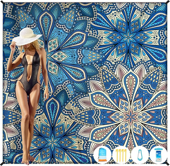 - Oversized Beach Picnic Mat:Package includes 4 ground stakes,1 carabiner,Keep out the wind because fixed With 4 fixed anchors,For vacation, hiking, or family garden parties.
