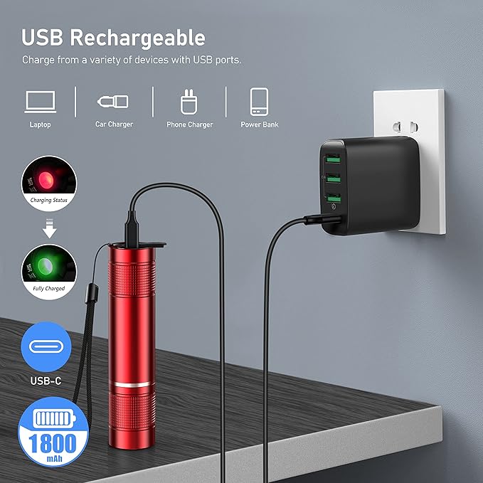 - USB C Rechargeable and Cable included: Built-in 1800 mAh can work up to 16 hours in normal use. You can charge this flashlight directly via the included USB C cable
