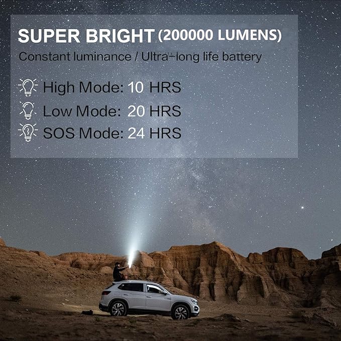 - Rechargeable spotlight with serious lasting power - UP TO 20 HOURS. Stop searching for batteries that are never there when you need them. This spotlight is made with 3 bulit-in ,long-lasting, rechargeable batteries with serious storage power (10000 mAh). A full charge is made to last longer than virtually any other flashlight - from 10 hours at 200,000 lumens to a whopping 20 hours at 100,000 lumens. Universal USB C charing port makes it easy to recharge in both car and home .