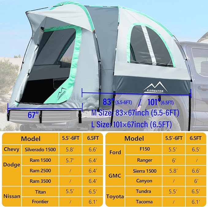 - 【Service】Our pickup tents Compatibility: The truck bed tent will fit for pickup truck with 5.5-6 ft bed. Compatible with F150, Ram, Silverado, Tundra, Sierra, Titan etc... they are extremely versatile and are undoubtedly a great choice for fishing trips, traveling, or festivals where a dedicated campground is unavailable. If you are unhappy with any aspect of our truck bed tent or if any parts are missing or damaged, contact us and we'll make it right.