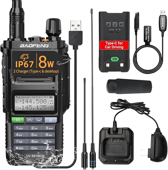 BAOFENG Radio UV-9R Pro Ham Radio Handheld Waterproof IP67 Two-Way Radio,with Type-C Charger Rechargeable Long Range Walkie Talkie for Adult with Programming Cable and Type-C Charging Cable