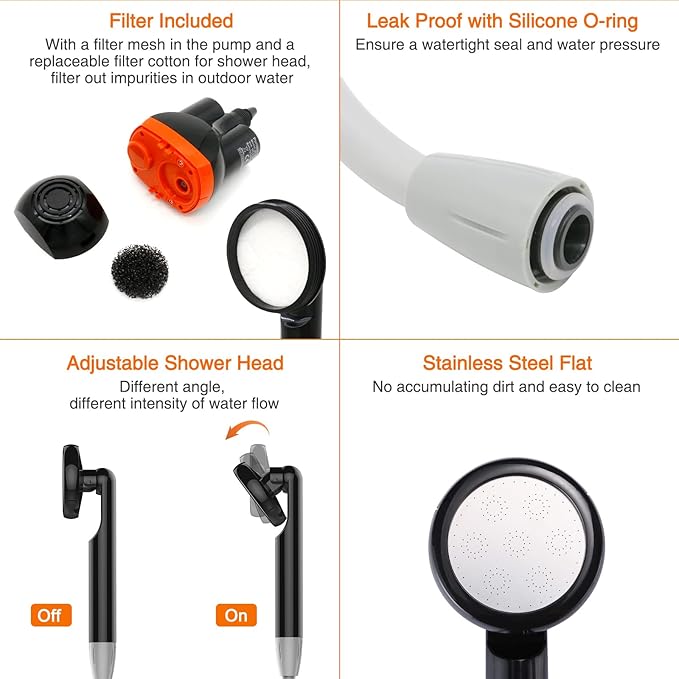 - Upgraded ON/OFF Shower Head: With innovative design of built-in valve, you can open or block water sprinkling and adjust the intensity of water flow by pressing down the shower head in different degree. This camping shower’s water outlet has stainless steel flat surface and fine holes, easier to clean and hard to accumulate dirt like traditional shower head. The portable shower head is more light and handy, even kids can grip it without effort