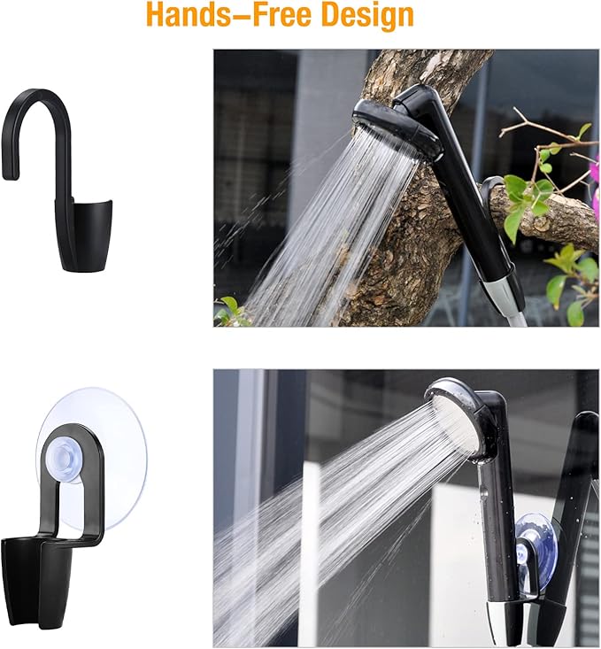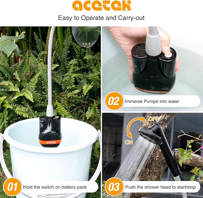 - Easy to Operate: After the shower pump, water hose and shower head are connected, fully immerse the pump in your bucket/tub of water, long press on white button to start, wait a few seconds for the water pumped up, then water splashing. The outdoor shower kit comes with a suction cup and S hook for you to hang the shower head overhead or mount on any flat surface like car window, help you enjoy a convenient and hands-free shower