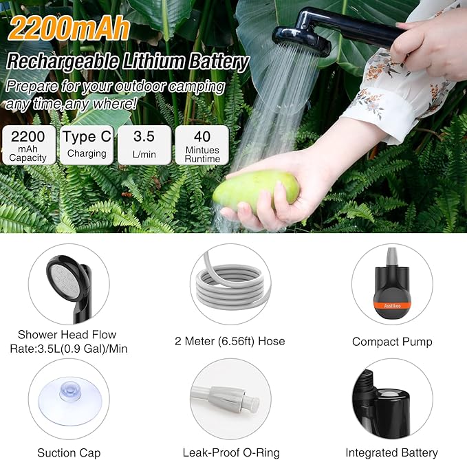 - Rechargeable Shower: The outdoor camping shower comes with a USB rechargeable 2200 mAh battery, which can work continuously up to 40~60 minutes with a full charge by power bank, phone adapter, laptop, car USB output. The integrated battery is more convenient to recharge by uncovering the waterproof cap of charging port, and has longer service life as it can avoid problems of loose contact and worn interface from other split type batteries