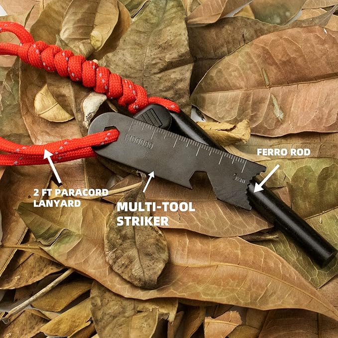 - BONUS EXTRAS - The fire starter kit comes with a range of unique extras, including a Magnesium Fire Starter, Wrist lanyard, Versatile tool (Striker with spark optimized edge, hex wrench, ruler, map scale, Carabiner, and Emergency whistle).