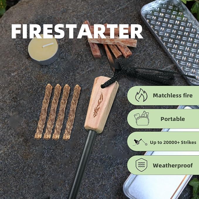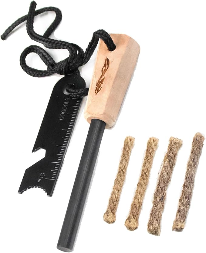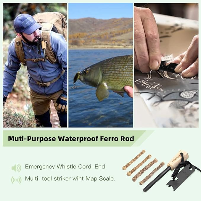 - BONUS EXTRAS - The fire starter kit comes with a range of unique extras, including a Magnesium Fire Starter, 10ft wrist lanyard, 6-in-1 versatile tool (Striker with spark optimized edge, hex wrench, ruler, map scale, Carabiner, and Emergency whistle