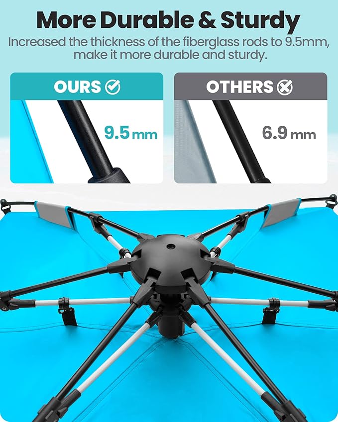 - 9.5MM Thickened Rods & 190T Material: We increased the thickness of the rods from 8.0mm (market standard) to 9.5MM and made with 190T Spring Asia Textile, this beach tent sun shelter is more rugged than other lower ones thus handle the wind firmly and stable without breaking or tearing