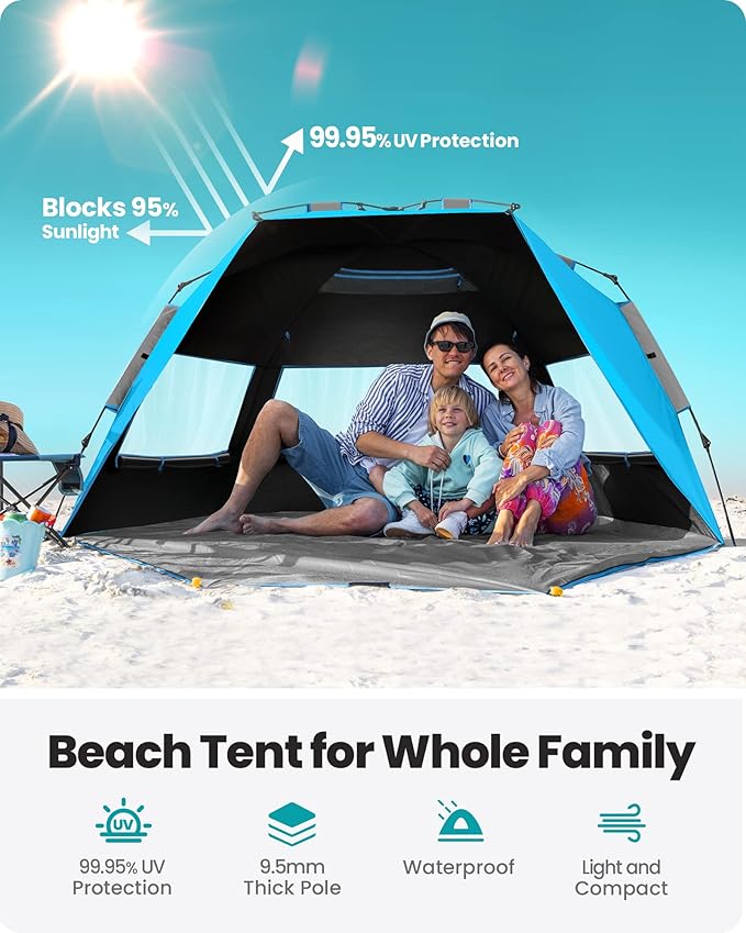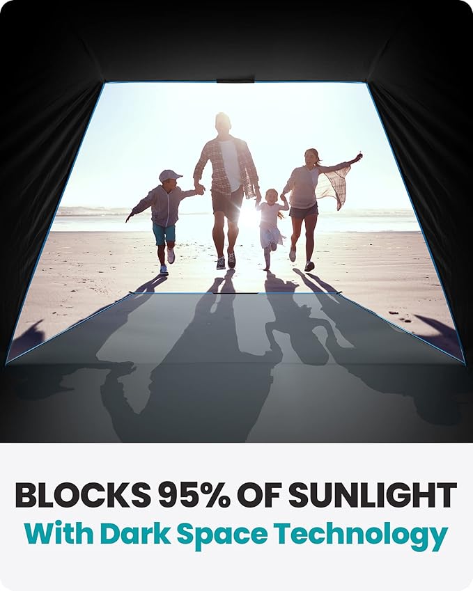 - Blackout Shelter Technology: Our Instant Shade Blackout Shelter is different from others on the market as it not only blocking 99.95% of UVA and UVB rays (UPF 50+), also eliminates 95% sunlight to protect your skin and objects for a more comfortable rest anytime of day