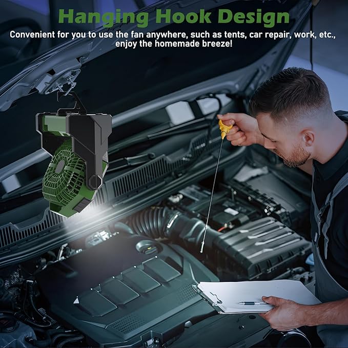- [Adjustable Angle & Hook Design] The camping fans has a 270° rotation adjustment function, which can provide a cool breeze to the desired direction. Equipped with a hook at the bottom, you can hinge the fan and place it anywhere, such as the top of a tent, hammock, and RV, etc. Enjoy a homemade breeze!