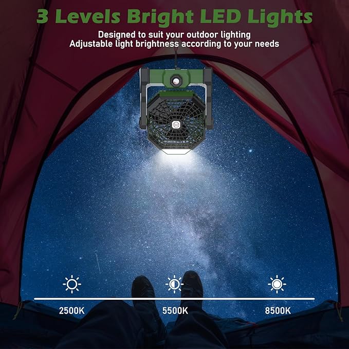 - [Super Bright LED Camping Light] The portable camping fan has 3 brightness settings. The lowest brightness can emit soft and non-glare light, which can be used as a night light when sleeping, and the highest brightness can illuminate the entire tent, providing enough light source for you outdoors at night. It is an ideal light source for night camping or hiking!