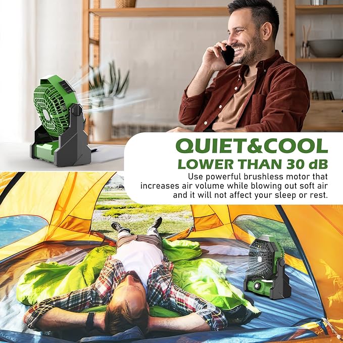 - [Quiet but Strong Wind] The camping fan adopts the latest brushless motor technology and high-performance ultra-thin fan blades, which can provide you with super strong airflow, the lowest noise (<30db), and keep the air circulation in the tent. The camping fan for tents adopts Stepless adjustment mode to meet different needs!