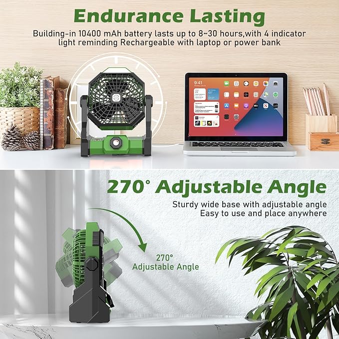 - [10400mAh Capacity Battery] Unlike other low-quality products on the market, the rechargeable camping fan has a built-in 10400mAh rechargeable battery, which can work continuously for 8-30 hours, bringing you more lasting coolness. The package includes a Type-C fast charging cable, and the rechargeable fan also supports laptop or power bank charging, so you don’t have to worry about power failure or being unable to use it outdoors!