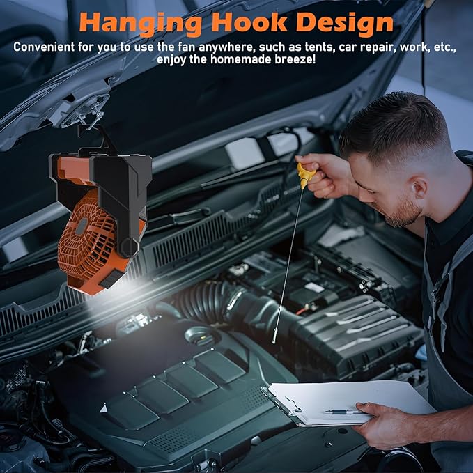 - [Adjustable Angle & Hook Design] The camping fans has a 270° rotation adjustment function, which can provide a cool breeze to the desired direction. Equipped with a hook at the bottom, you can hinge the fan and place it anywhere, such as the top of a tent, hammock, and RV, etc. Enjoy a homemade breeze!