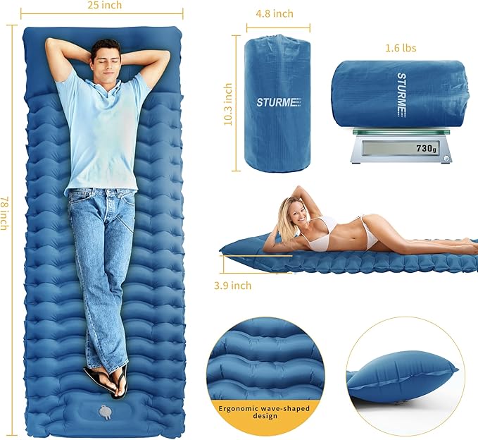- 3.9 Inch Extra Thick Cozy sleeping pad: STURME camping sleeping pad is designed with ergonomic wave air cell to ensure that all your weight is evenly distributed on the pad. 3.9 Inch Thickness can keep your body away from the damp and cold rough ground