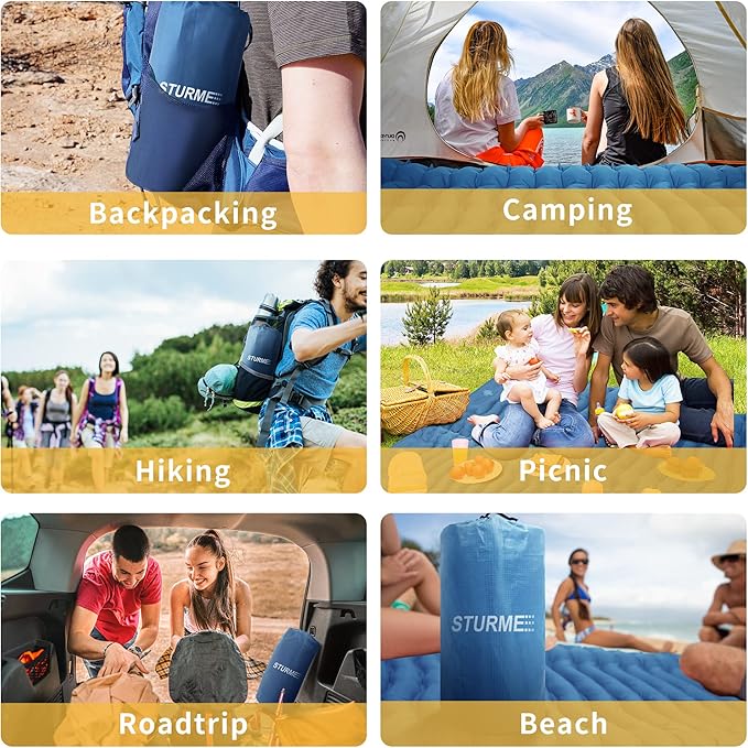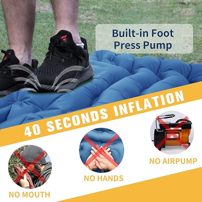 - 40s Fast Inflation:The STURME camping sleeping mat is equipped with a durable built-in foot pump, it only takes about 40 seconds to fully inflate. The leak-proof membrane makes air leakage no longer bother you. 5-second deflation for quickly pack up