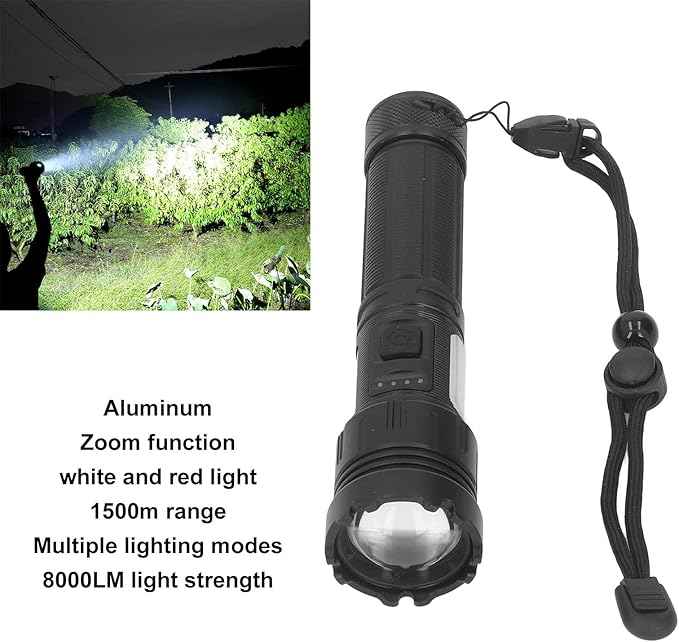 - ✔️【1500 Meters Range】: Super bright flashlight maximum range can attain 1500 meters, 8000LM light strength, white light and red light.