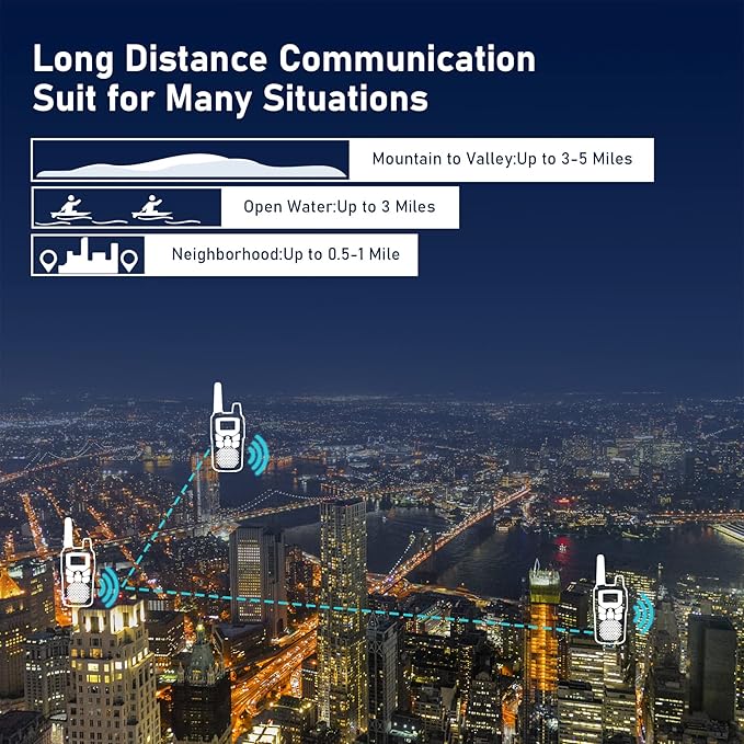 - Long Rang Walkie Talkies:Erelis long rang walkie talkeis can reach 3-5 miles in open aress like moutain vally.The walkie talkeis can reach 0.5-1 mile in cities.Weather, buildings, obstacles and other circumstances can affect communication distances