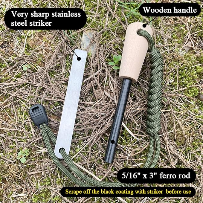 - ANY WEATHER: The ferro rod & hemp tinder fire starter kit will perform well no matter the environment is humid or hypoxic. The wooden handle is non-slip and the hemp rope is waterproof. NOTE: MAKE SURE ONE END OF THE HEMP TINDER IS FLUFFY BEFORE USE.