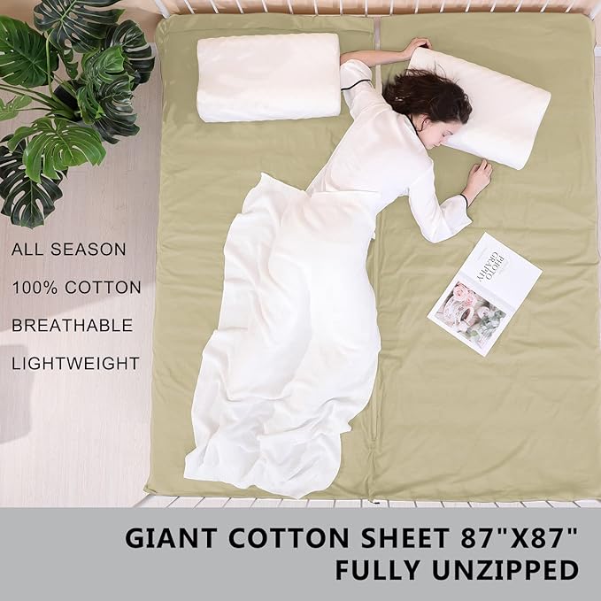 100% Cotton Sleeping Bag Liner with Full Length Zipper on 3 Sides; Single/Double Adult Sleep Sack for Travel & Camping, Multifunctional Travel Sheets (Unzipped 87”x87”) for Hotel, Lightweight