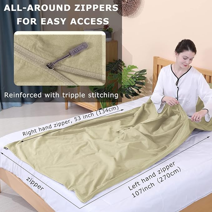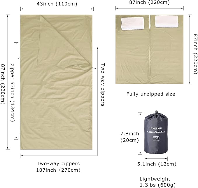 - This XL sleeping sheet provide you with comfort when traveling. It’s wide (87x43 inches) and allows you to turn inside it without being twisted. Full-length zippers run along left, right side and also the bottom of the sheet, which enables you to get in and out of easily from any side of your bed, stretch your feet out of the bag for comfort. This multifunctional sleep sack also turns into one giant cotton bed sheet (87X88 inches) when fully unzipped. The pocket keeps your pillow in place.