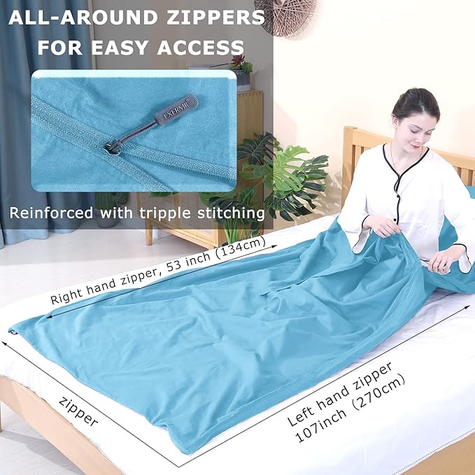 - This XL sleeping sheet provide you with comfort when traveling. It’s wide (87x43 inches) and allows you to turn inside it without being twisted. Full-length zippers run along left, right side and also the bottom of the sheet, which enables you to get in and out of easily from any side of your bed, stretch your feet out of the bag for comfort. This multifunctional sleep sack also turns into one giant cotton bed sheet (87X88 inches) when fully unzipped. The pocket keeps your pillow in place.