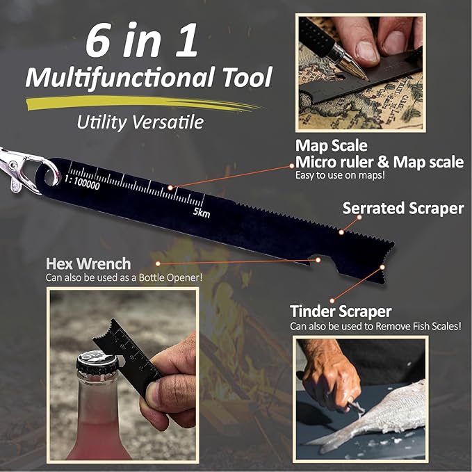 - 7-in-1 FIRE STARTER KIT: The survival fire starter set is a perfect tool as it combines utility and convenience, which includes a long waxed cord 36 Inch, aluminum storage capsule, built-in compass, high-quality steel striker. The multifunctional striker comes with a ferro scraper that can be used as a bottle opener and serrated scraper.