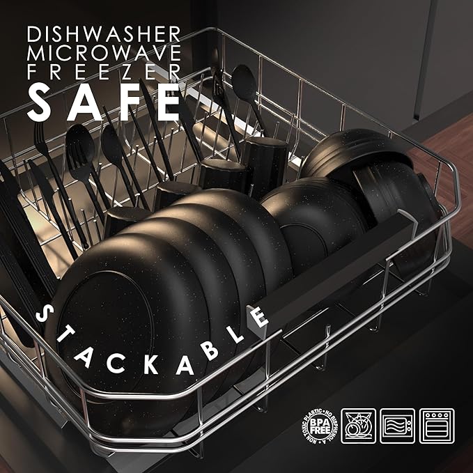 - STACKABLE & NON STAINABLE : Our Lightweight Dinnerware Set Is A Healthy Alternative To Plastic Dishes Set. The Dorm Kitchen Essentials aka Rv Dinnerware Sets Are Stain Resistant & Travel Friendly!