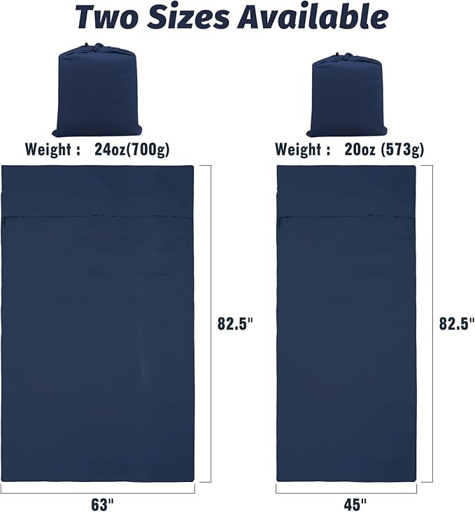 • ♥【Two Sizes Available】The sleeping bag liner has two sizes for your choose. Single 45"x 82.5" that fits one people, Double 60"x 82.5" that fits two people. The space is large enough even for different people to move around and stretch out the legs.
