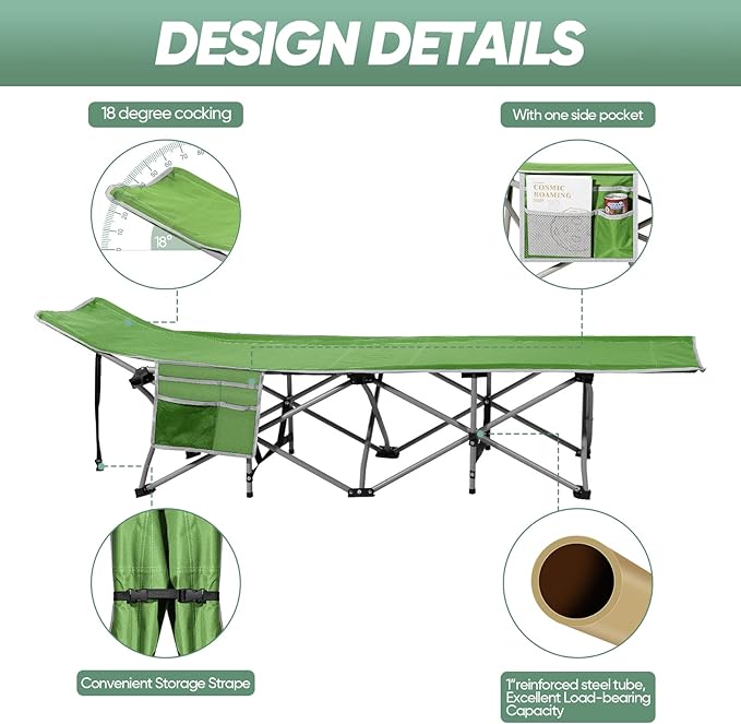 HAITRAL Portable Camping Cot with Mattress - Outdoor Folding Heavy Duty Sleeping Bed with Side Pocket for Adults - Oxford Single Lounge Chaise for Camping Tent Beach Office Max Load 300 LBS (Green)