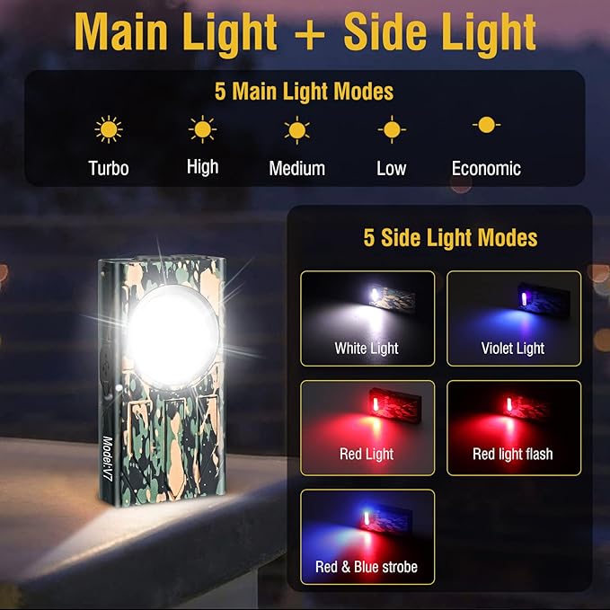 - MULTIFUNCTIONAL WORK LIGHTS➤➤The main lamp and side lamp are controlled by two buttons, which can be operated with one hand, making it convenient and convenient. The 10 lighting modes can be switched at will to meet various lighting needs,including red and blue warning, UV violet light, red light, Make it a great all-purpose flashlights for daily use and outdoor activities, such as work light and warning lights.