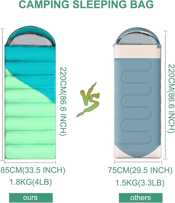 - OPTIMIED DIMENSION:Our sleeping bag measures 86.6x33.5 inches (220x85cm) when expanded, and weighs 1.8kg/3.96lb. It's designed to give adults kids plenty of space to move around and get a good night's sleep after a hard day's activity.