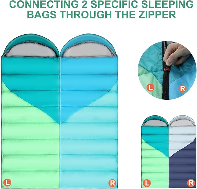 - ROMANTIC DESIGN:The side zipper allows two specific color sleeping bags to be spliced together to form a love heart, becoming a large double sleeping bag for couples, lovers, or sisters. It's the perfect way to make camping romantic and meaningful.