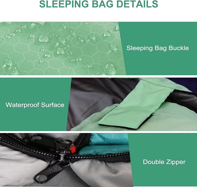 - MULTI-FUNCTION:Adults & kids sleeping bags features a high-quality double-sided zipper that won't snag, and separate zippers at the foot that allow you to adjust the amount of warm or cold air that enters or exits the bag. You can even fully open the sleeping bag and use it as a blanket.