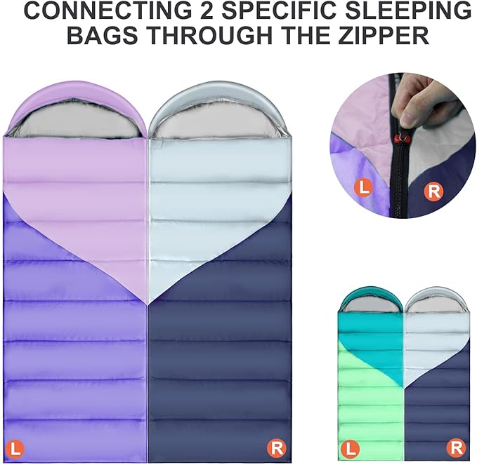 - ROMANTIC DESIGN:The side zipper allows two specific color sleeping bags to be spliced together to form a love heart, becoming a large double sleeping bag for couples, lovers, or sisters. It's the perfect way to make camping romantic and meaningful.