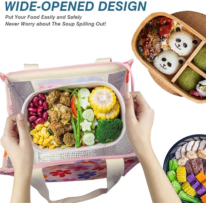 - WIDE-OPEN & VELCRO CLOSURE: the entrance of the thermal lunch box can be opened up to 9.4"L x 6.7"W big. Therefore your containers can be put into the bag and taken out of the bag HORIZONTALLY without risking leaking or spilling. Velcro closure not only makes easy access to your food but also tightly secures your foods in the bag.