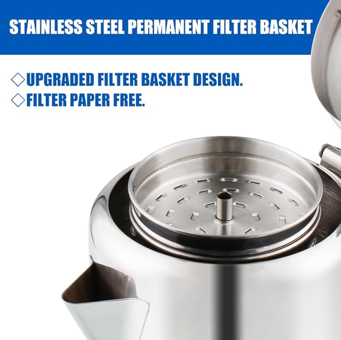 - 【PERMANENT FILTER BASKET】This percolator coffee pot features a permanent filter basket, so you don't need to use messy coffee filters. The permanent filter basket is made of food grade stainless steel, making it very easy to clean and reuse.