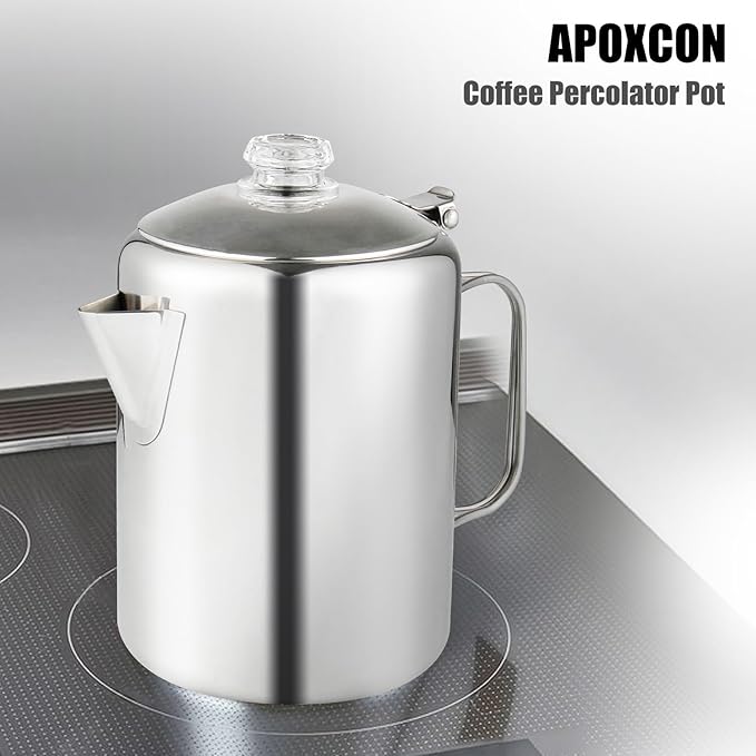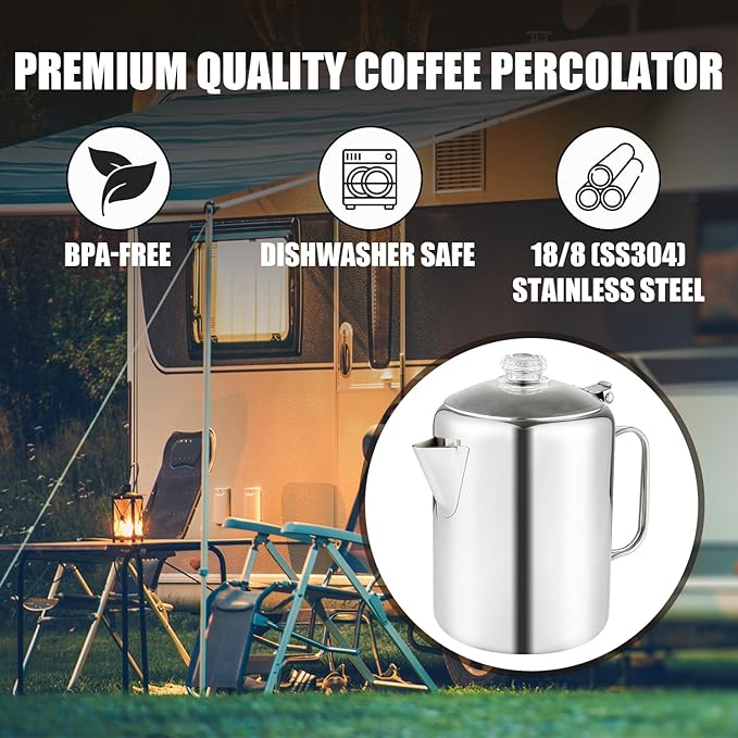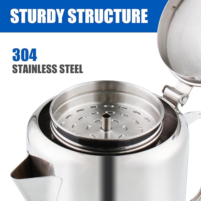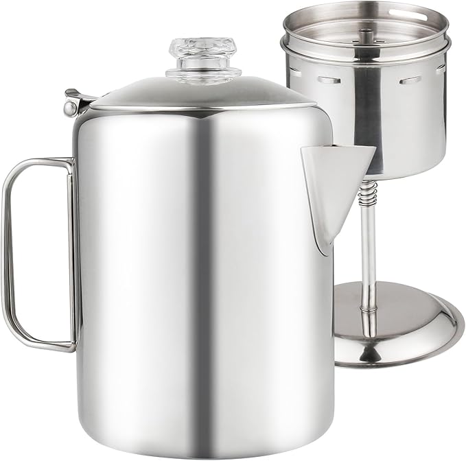 - 【FOOD GRADE MATERIAL】The percolator body, cover and filter basket are made of quality 18/8 (SS304) stainless steel, which allows it to withstand drops and impacts during use. No aluminum and plastic, toxin free and corrosion-resistant.