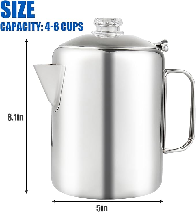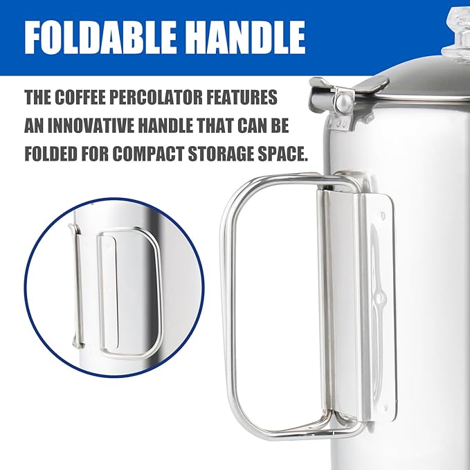 - 【COMPACT AND PORTABLE】This coffee percolator pot can hold up to 8 cups of coffee. Metal wire handle is foldable for easy storage. The compact structure makes the coffee pot very easy to carry.