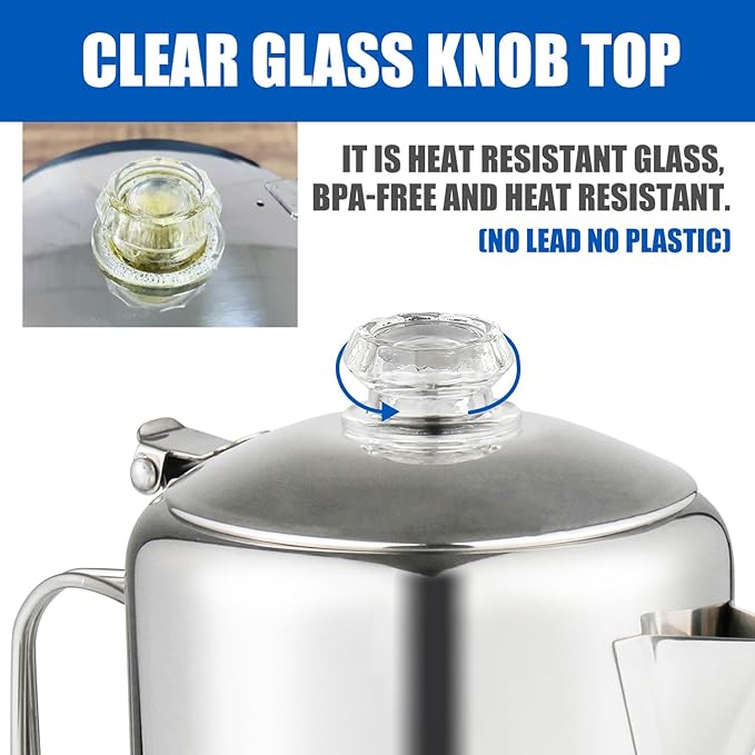 - 【CLEAR GLASS KNOB TOP】The knob top is made of heat resistant glass, which is safer than plastic material. Clear glass knob top lets you view your coffee while it' s brewing.