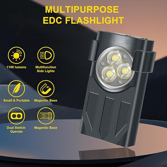 - 【5 Light Modes & 5 Side light Modes】 The compact mini flashlight has 5 light modes to meet your different need: TURBO, HIGHT, MED, LOW, MOON. (Double tap to turn on ultra bright mode,Long press to close) Side light button mode: (A. Double click switch: White light - Purple light - Red light - Red light flashing - Red blue light flashing B. Long press to close C. Continuous press 3 times - Red blue light flashing)