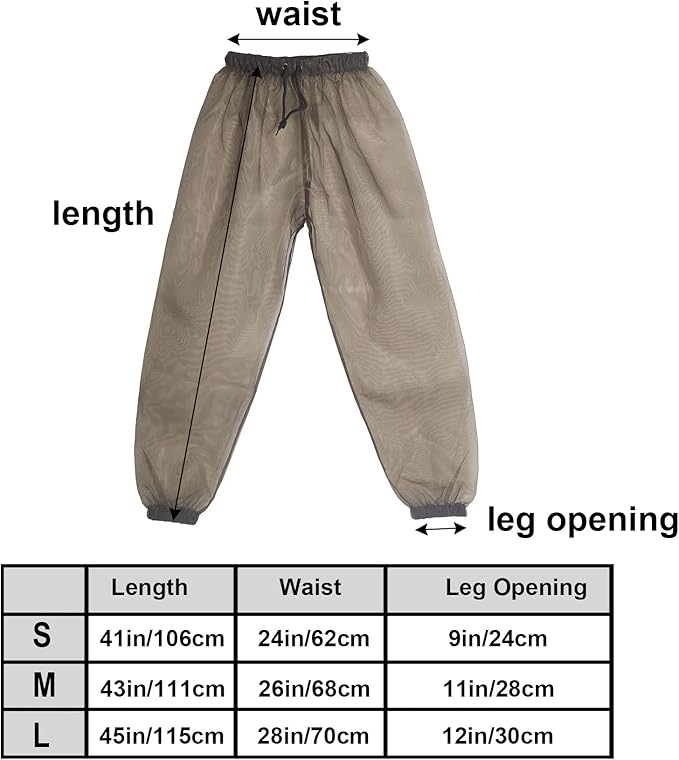 - The mosquito pants are available in 3 sizes, S: 106x62x24cm/41x24x9in (length x waist x leg opening); M: 111x68x28cm/43x26x11in (length x waist x leg opening); L: 115x70x30cm/45x28x12in (length x waist x leg opening)