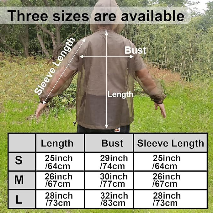 - The mosquito jackets are available in 3 sizes, S: 64x74x64cm/25x29x25in (length x bust x sleeve length); M: 67x77x67cm/26x30x26in (length x bust x sleeve length); L: 73x83x73cm/28x32x28in (length x bust x sleeve length)