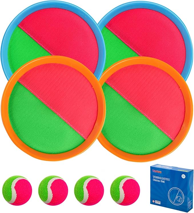 - 【Super fun toys & games 】: Our spike ball game set comes with 4 paddles , 4 balls, and a carrying bag, perfect throw-and-catch game for littles who don’t have the coordination or ability to play with baseballs. The balls stick well to the “mits”,kids enjoy playing with this toss game set and have a great time playing It's a great backyard games for adults and family.