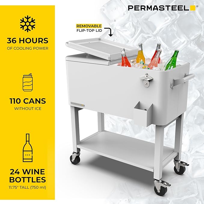 Permasteel 80-Qt Outdoor Patio Cooler with Removable Basin, Outside Beverage Cooler Cart, Rolling Cooler with Wheels and Handles, White