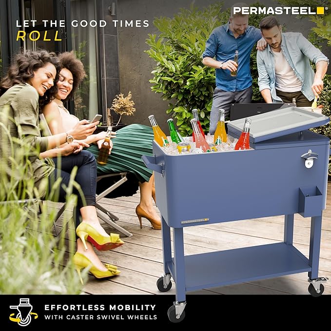 Permasteel 80-Qt Outdoor Patio Cooler with Removable Basin, Outside Beverage Cooler Cart, Rolling Cooler with Wheels and Handles, Azure Blue