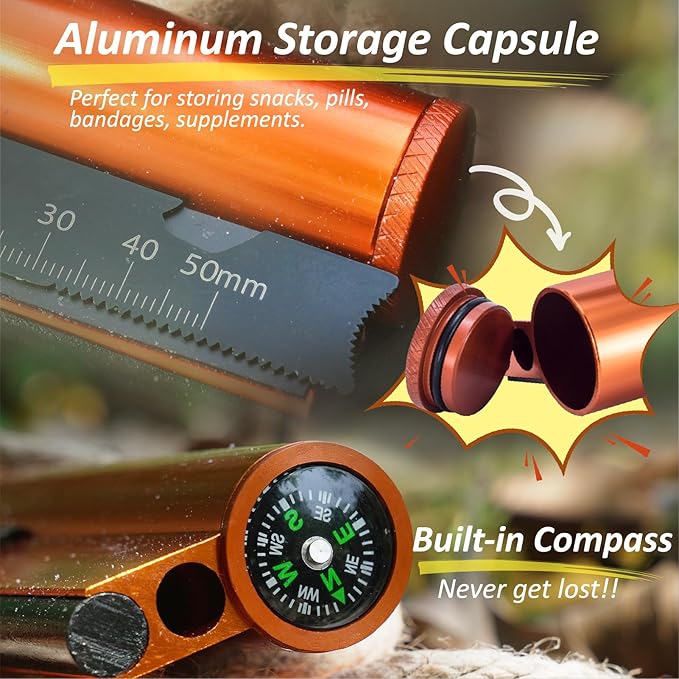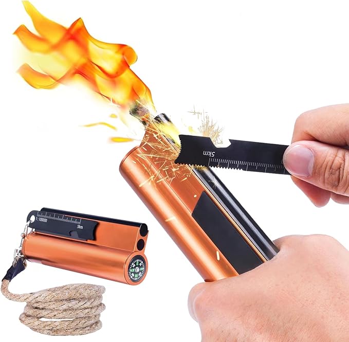 - 👍【7-in-1 FIRE STARTER KIT】The survival fire starter set is a perfect tool as it combines utility and convenience, which includes a long waxed cord 36 Inch, aluminum storage capsule, built-in compass, high-quality steel striker. The multifunctional striker comes with a ferro scraper that can be used as a bottle opener and serrated scraper.