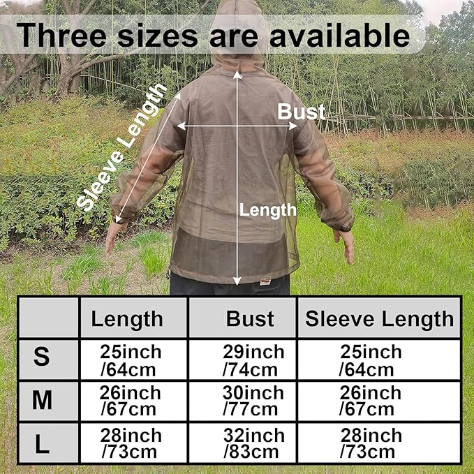 • The mosquito jackets are available in 3 sizes, S: 64x74x64cm/25x29x25in (length x bust x sleeve length); M: 67x77x67cm/26x30x26in (length x bust x sleeve length); L: 73x83x73cm/28x32x28in (length x bust x sleeve length)