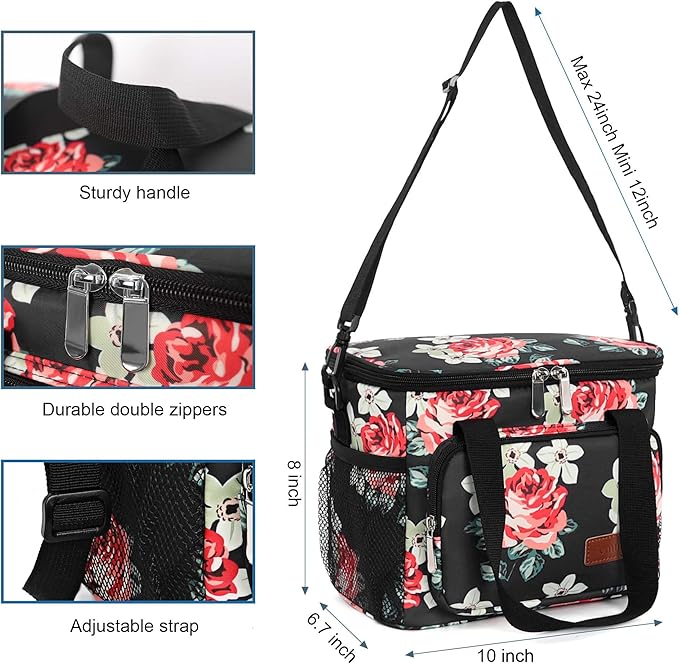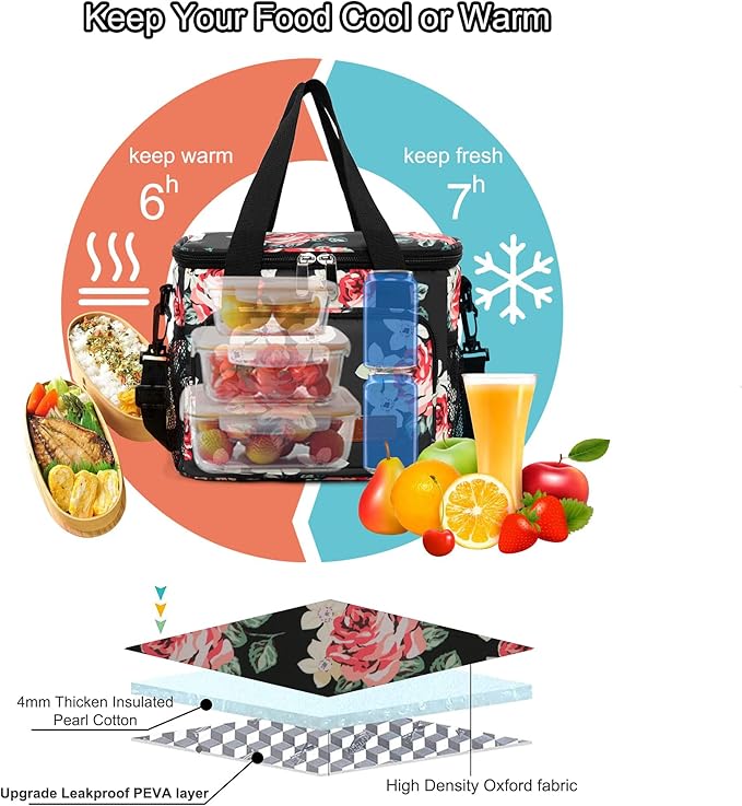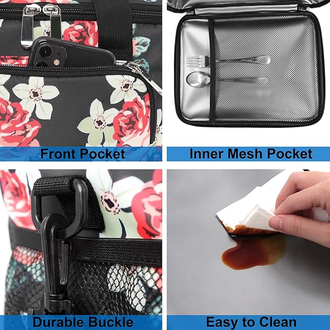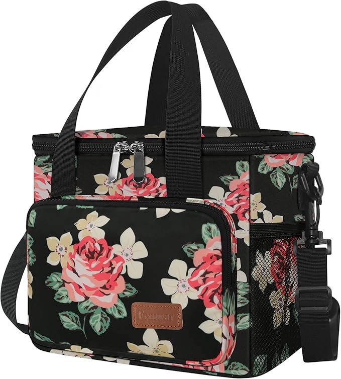 Femuar Lunch Bags for Women/Men, Insulated Lunch Bag for Work Office Picnic - Lunch Cooler Bag Leakproof Lunch Box with Adjustable Shoulder Strap - Black Floral