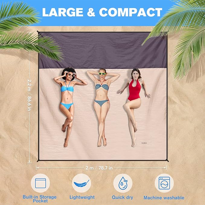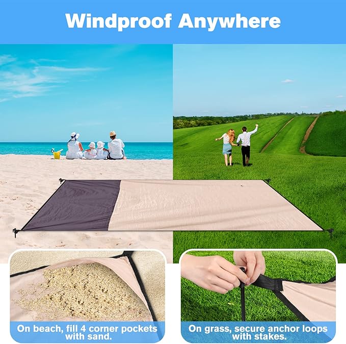 - 【Sand Resistance & Windproof】Outdoor beach blanket is sand proof and quick drying. Just shake it gently, the sand slips off easily. Comes with 4 lager corner sand pockets, 4 anchor loops and 4 pieces ABS stakes. Secure blanket on beach / grass with sand and stakes to prevent blanket blowing away on windy days.